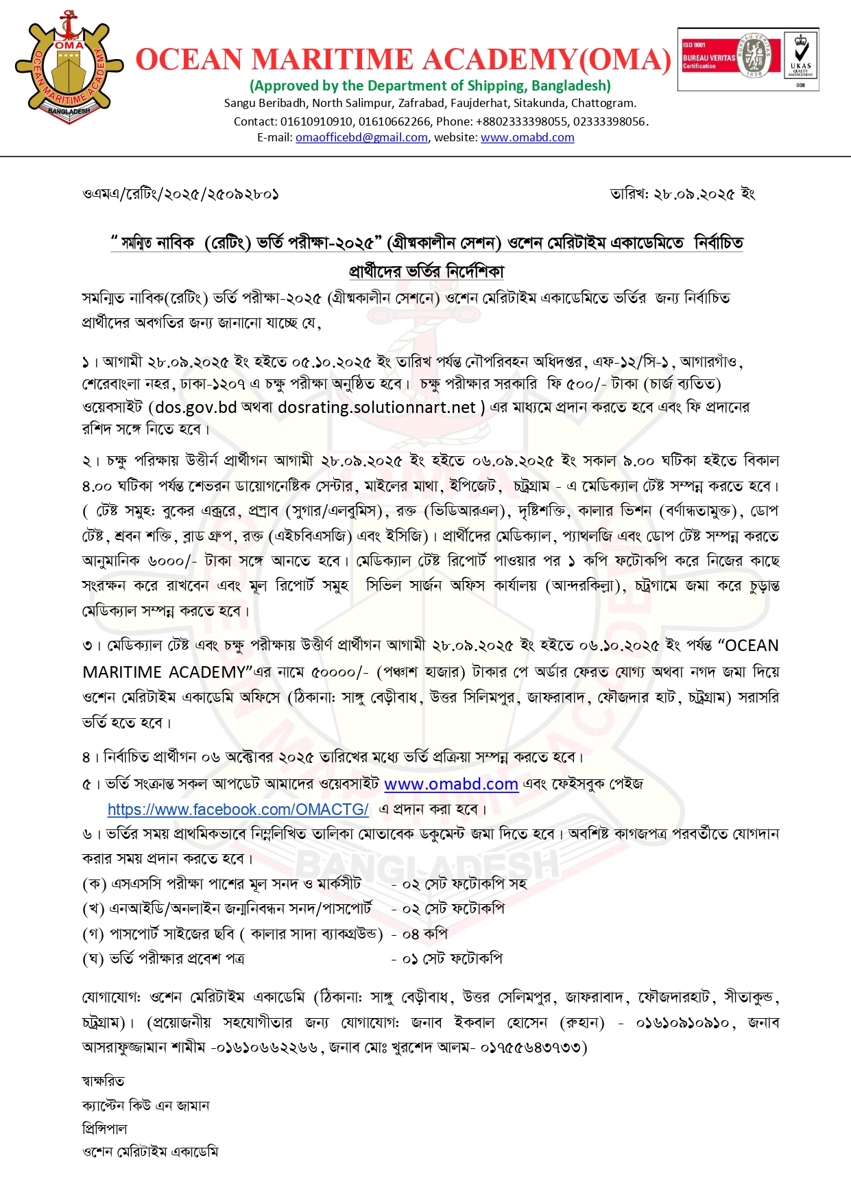 সমন্মিত নাবিক(রেটিং) ভর্তি পরীক্ষা-২০২৫ (গ্রীষ্মকালীন সেশনে) ওশেন মেরিটাইম একাডেমিতে ভর্তির জন্য নির্বাচিত প্রার্থীদের ভর্তির নির্দেশিকা